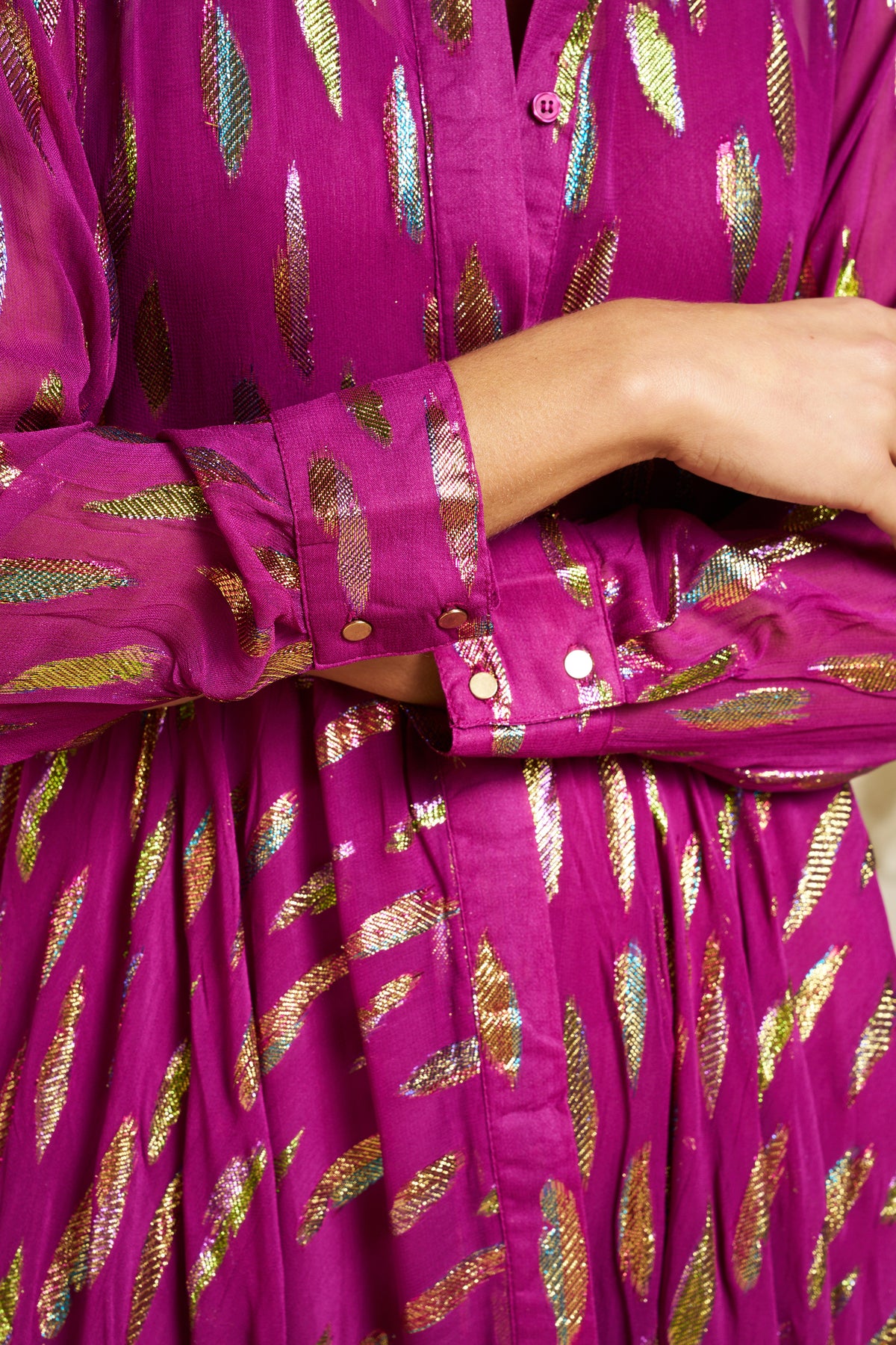 - a second long-sleeved dress in jacquard viscose crepe featuring multicolored leaf motifs embroidered in lurex. Airy and sheer, it's worn over the first dress, creating a play of veils and transparencies enhanced by the intensity of its fuchsia hue.