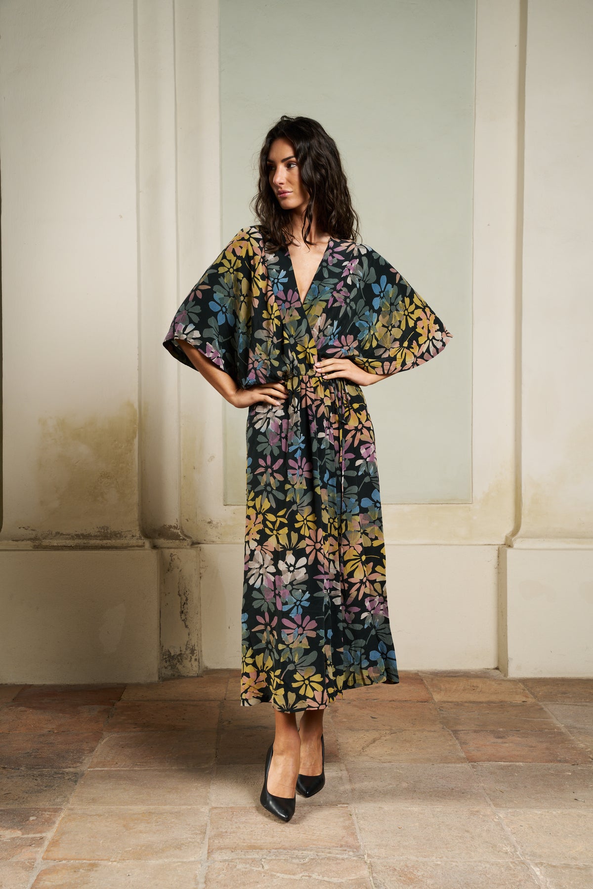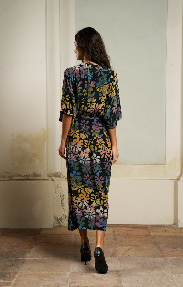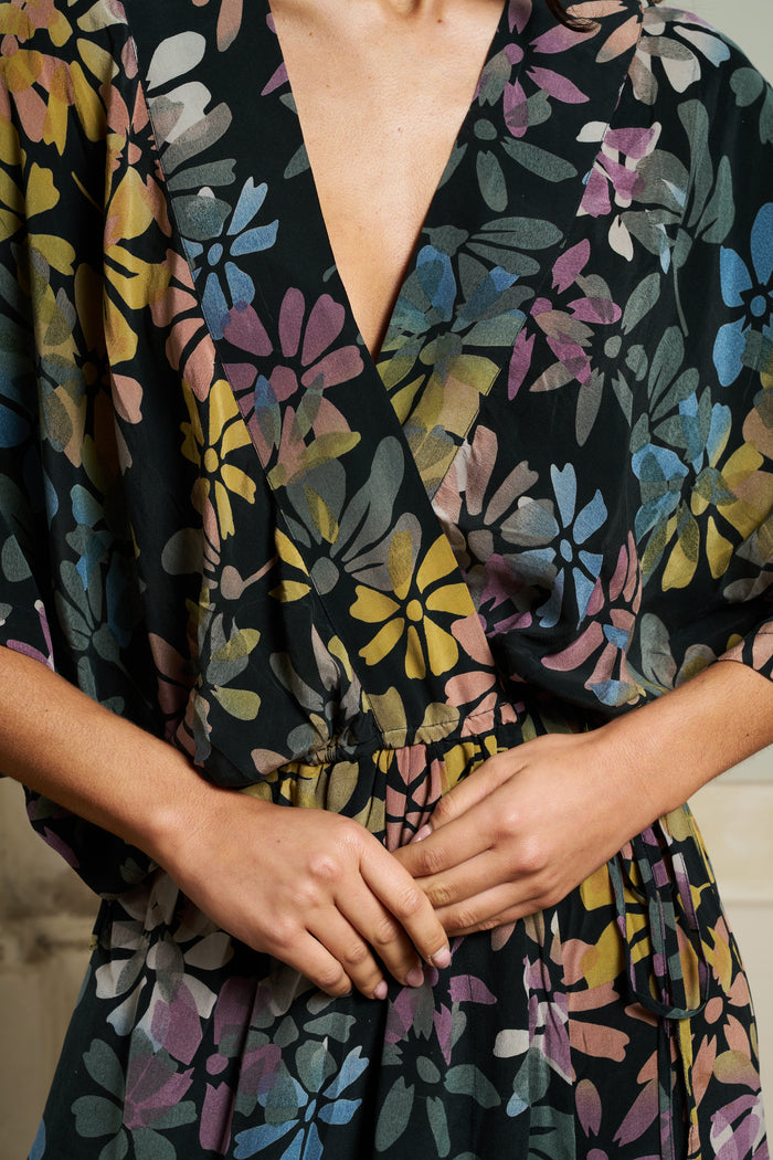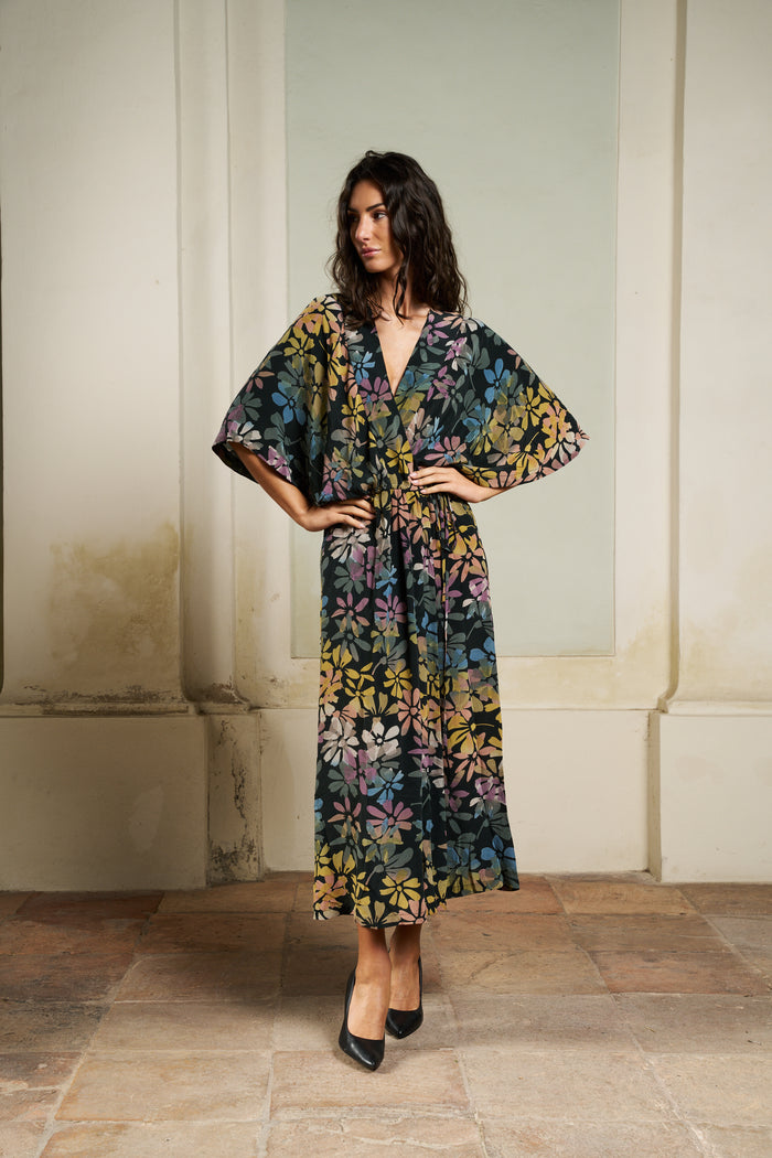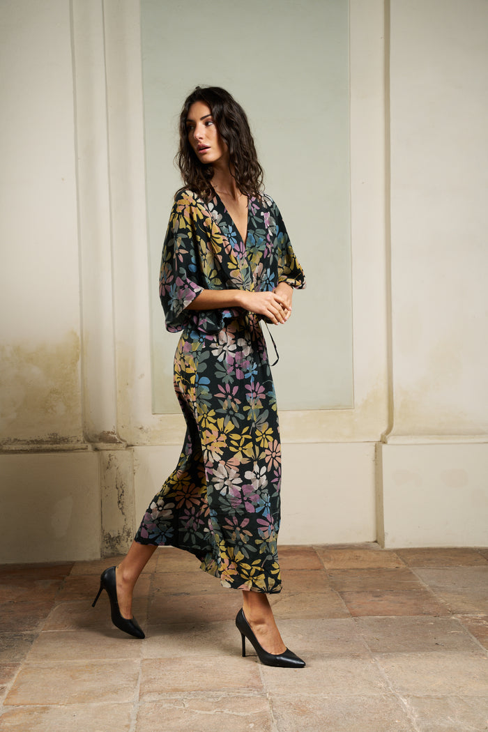 The Brenda Wrap is a feminine, wrap dress with wide shoulders that drape over the upper arm.