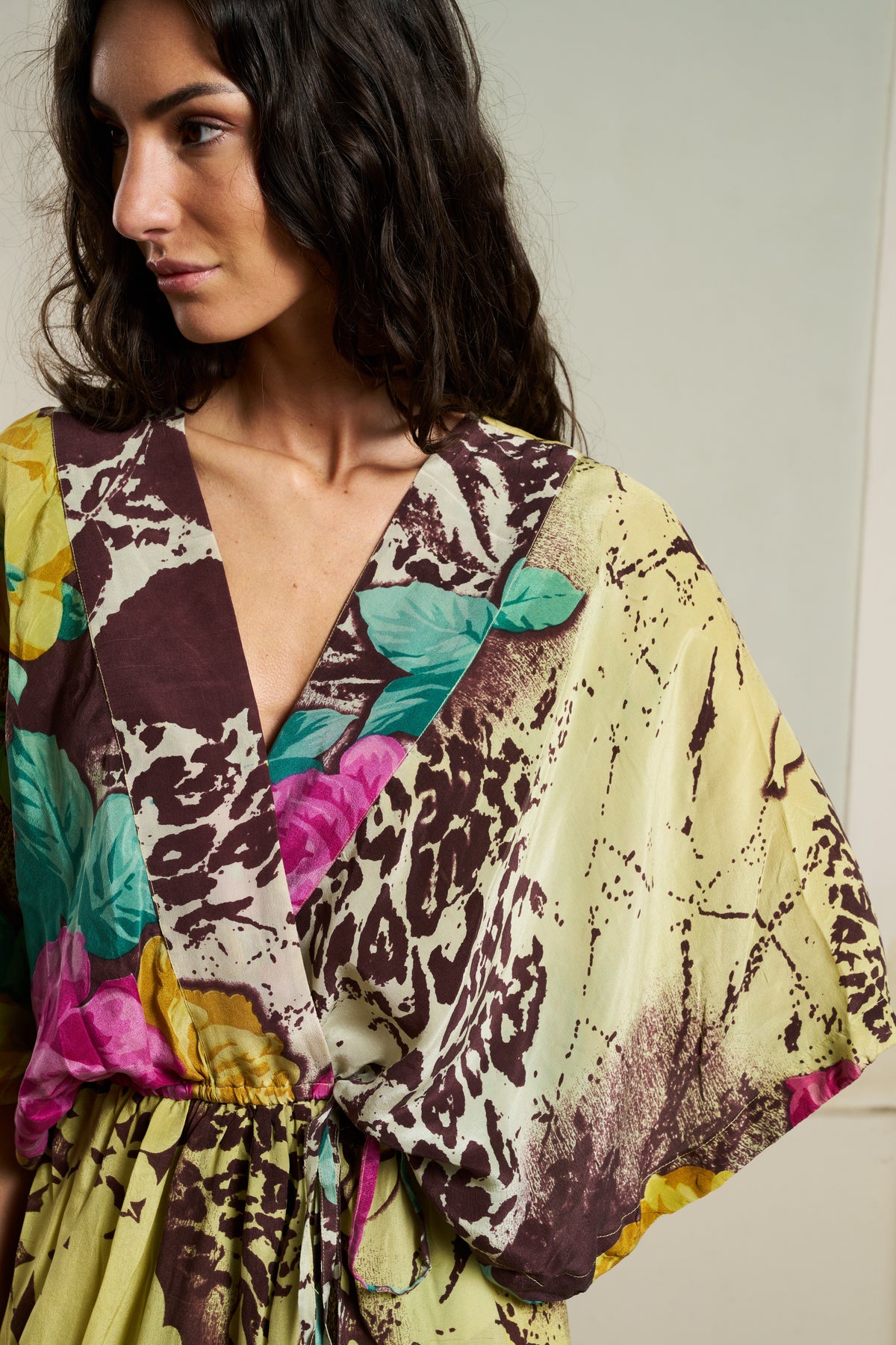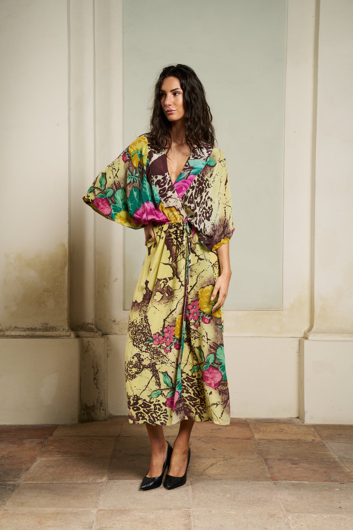 The Brenda Wrap is a feminine, wrap dress with wide shoulders that drape over the upper arm.
