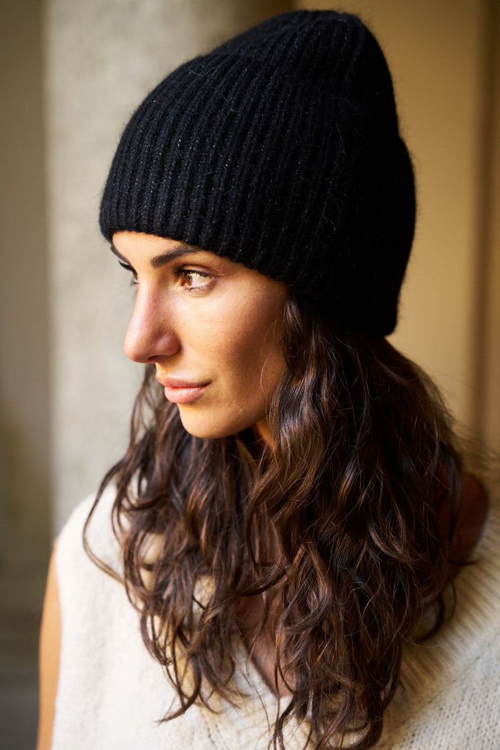 Cappello con risvolto in angora con paillettes, morbido e caldo, ideale per look casual ed eleganti.