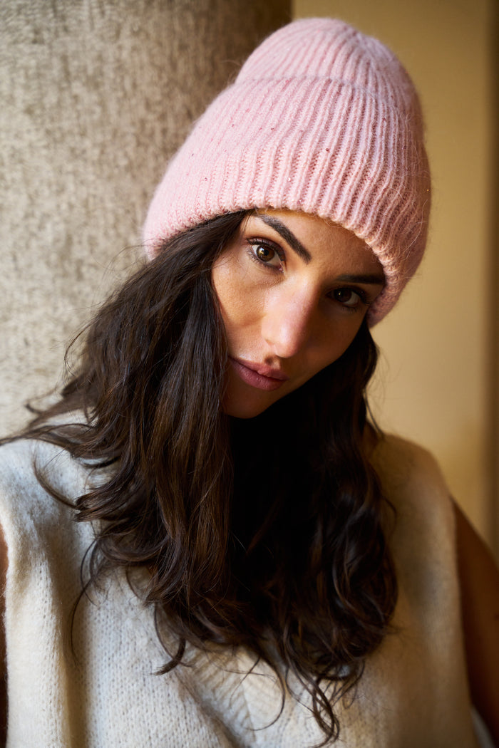 Cappello con risvolto in angora con paillettes, morbido e caldo, ideale per look casual ed eleganti.