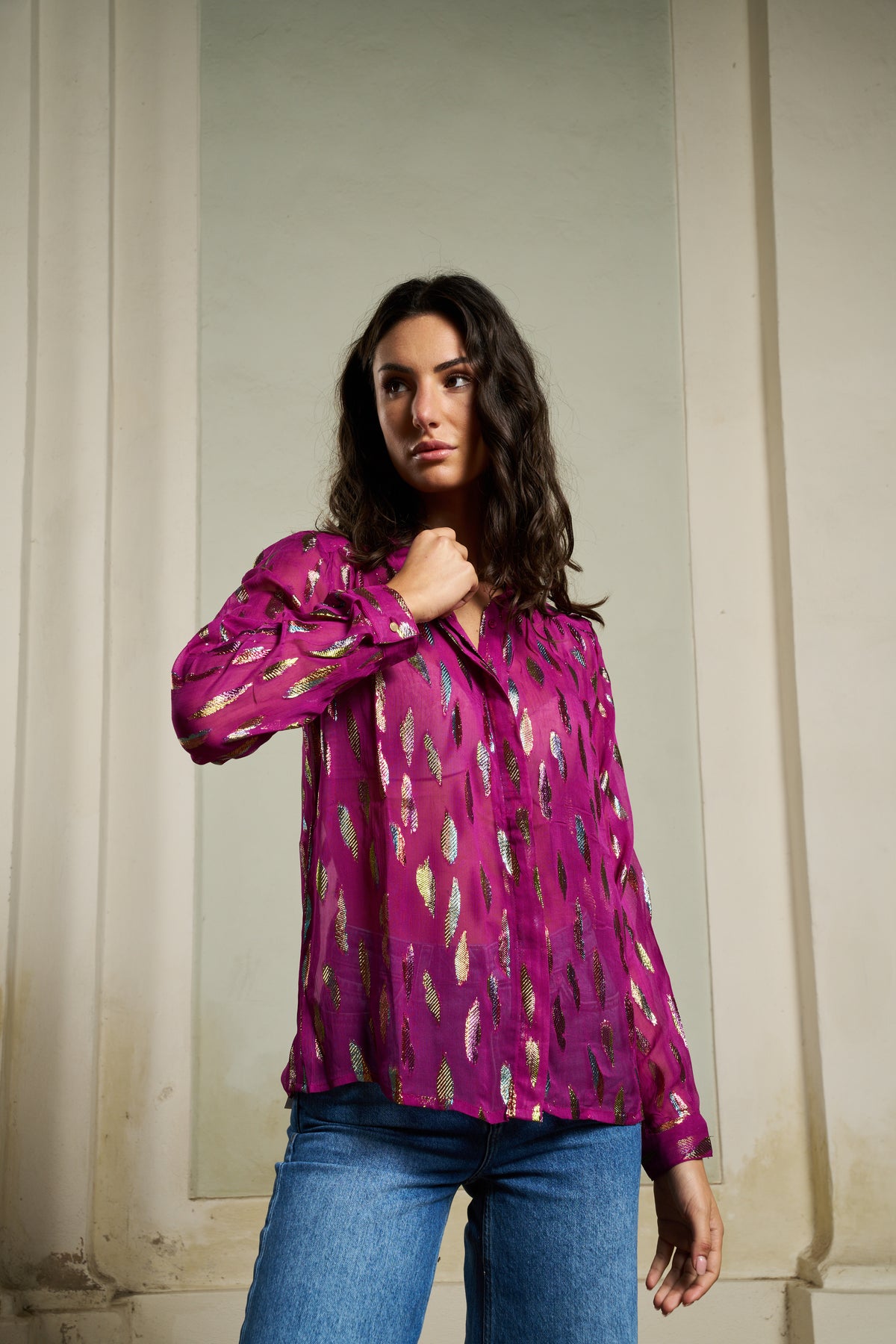 Festive and lively, the Raffaella shirt is made of a multicolored lurex jacquard viscose voile with leaf motifs.