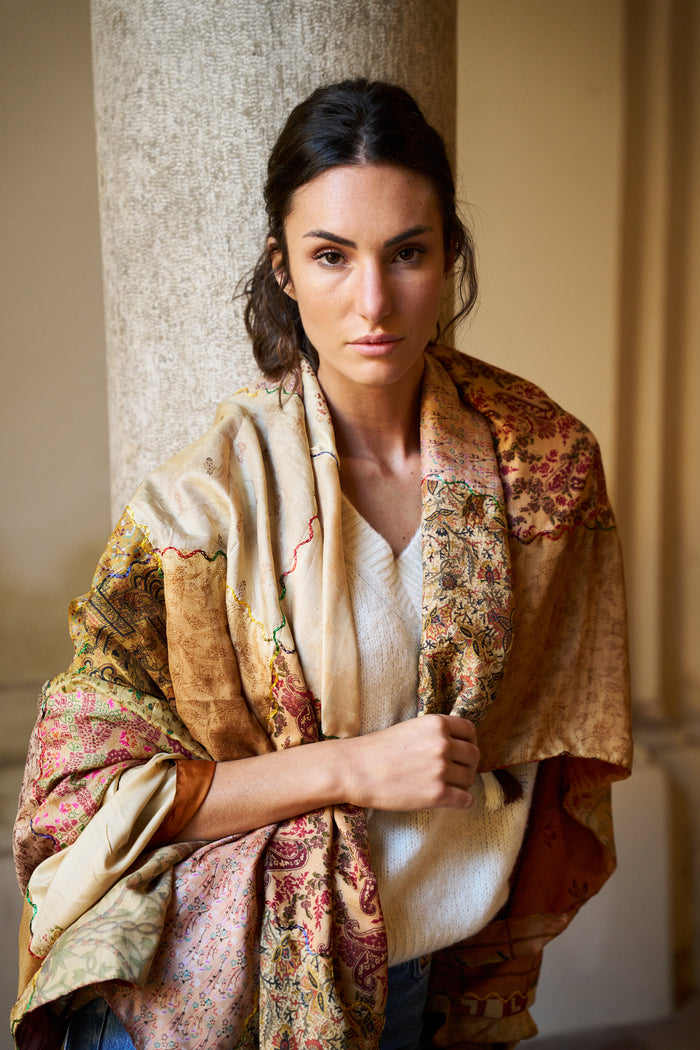 Foulard quadrato in 100% seta, patchwork esclusivo con nappine: stile raffinato e originale.