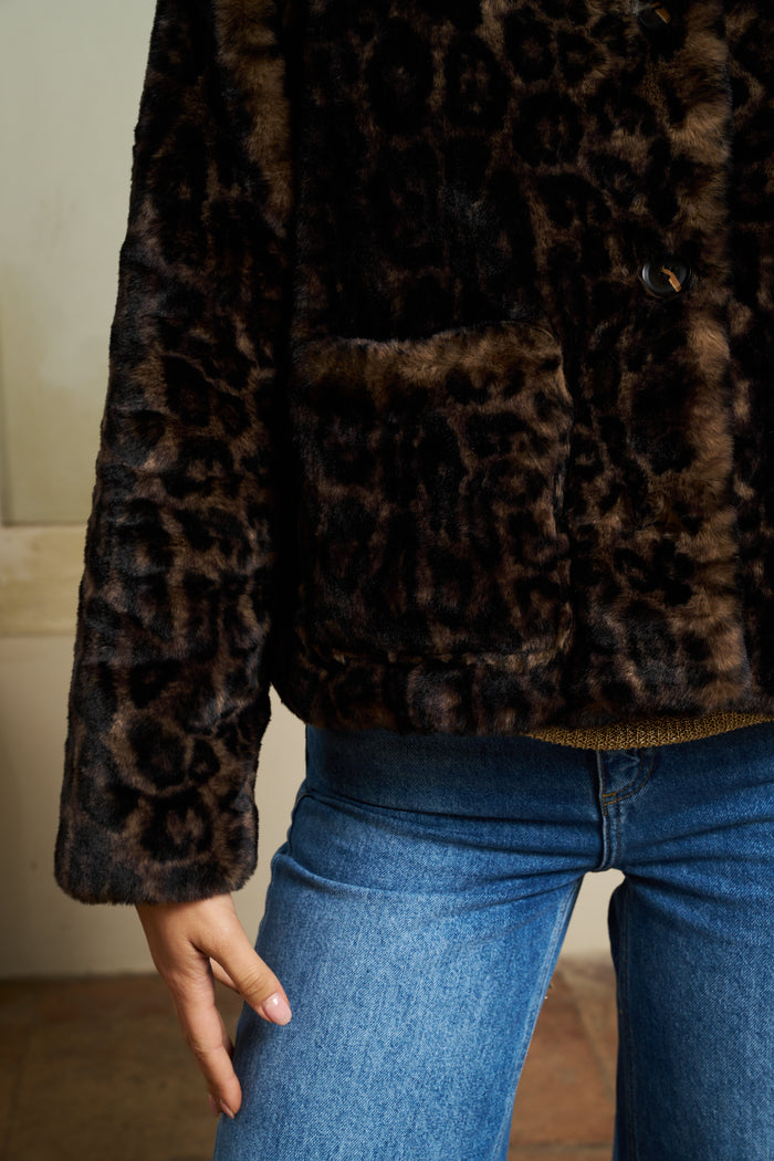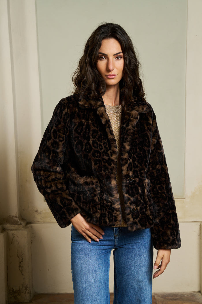 Giacca soffice in pelliccia sintetica con stampa leopardata all-over. Collo a revers e maniche lunghe. Abbottonatura. Due tasche frontali applicate.