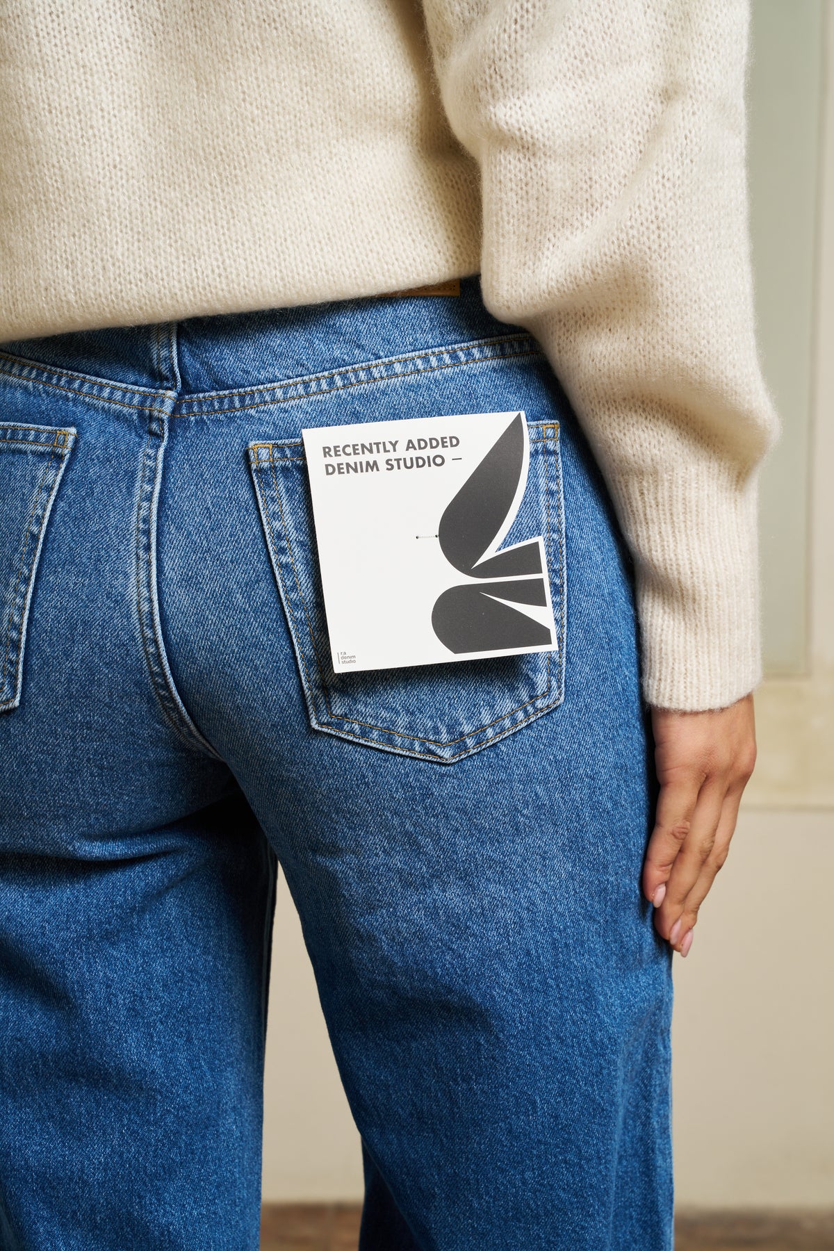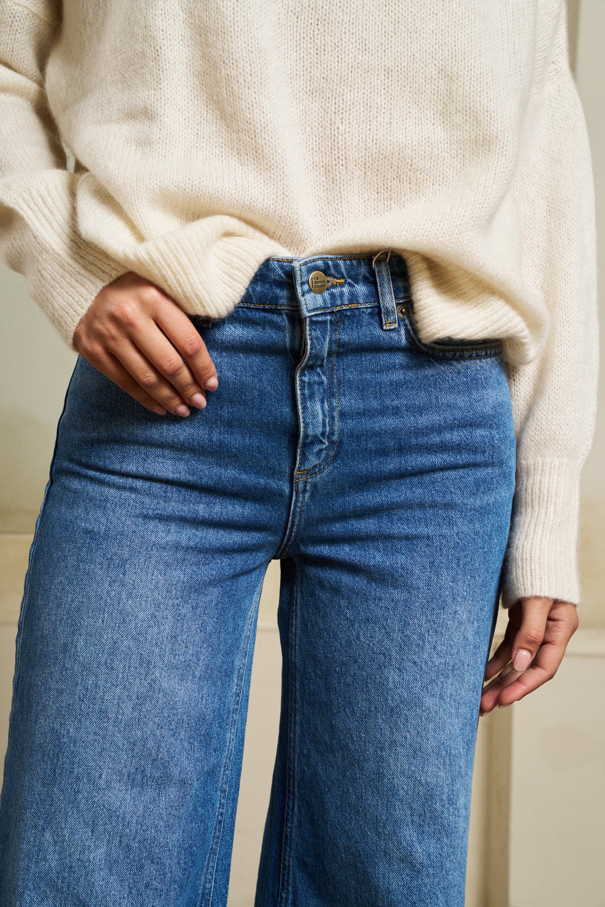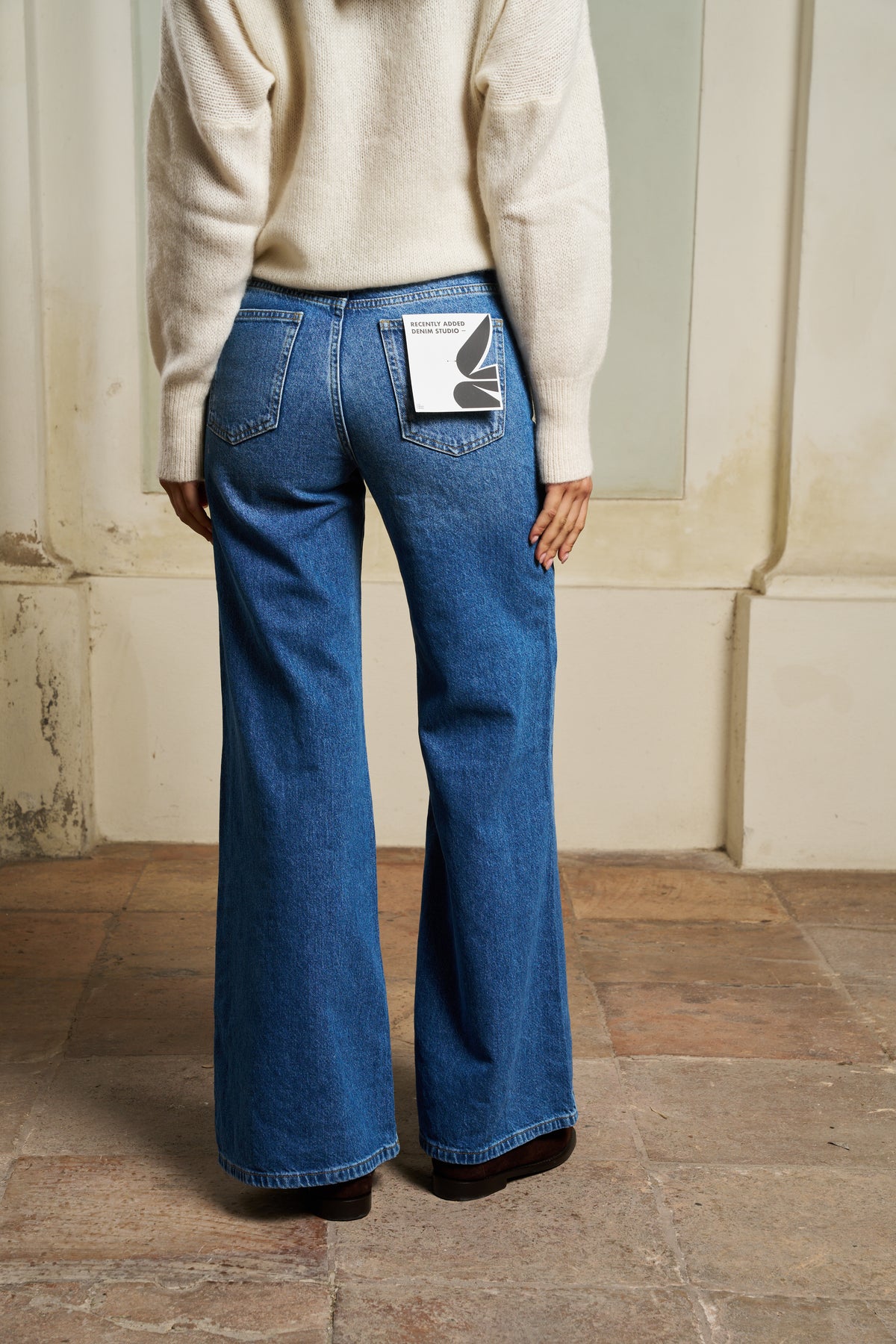 Wide-leg, flared jeans, comfortable and versatile. Made from sustainable fabrics: 80% organic cotton and 20% recycled cotton . Contemporary style with a retro touch, perfect for casual and refined looks.
