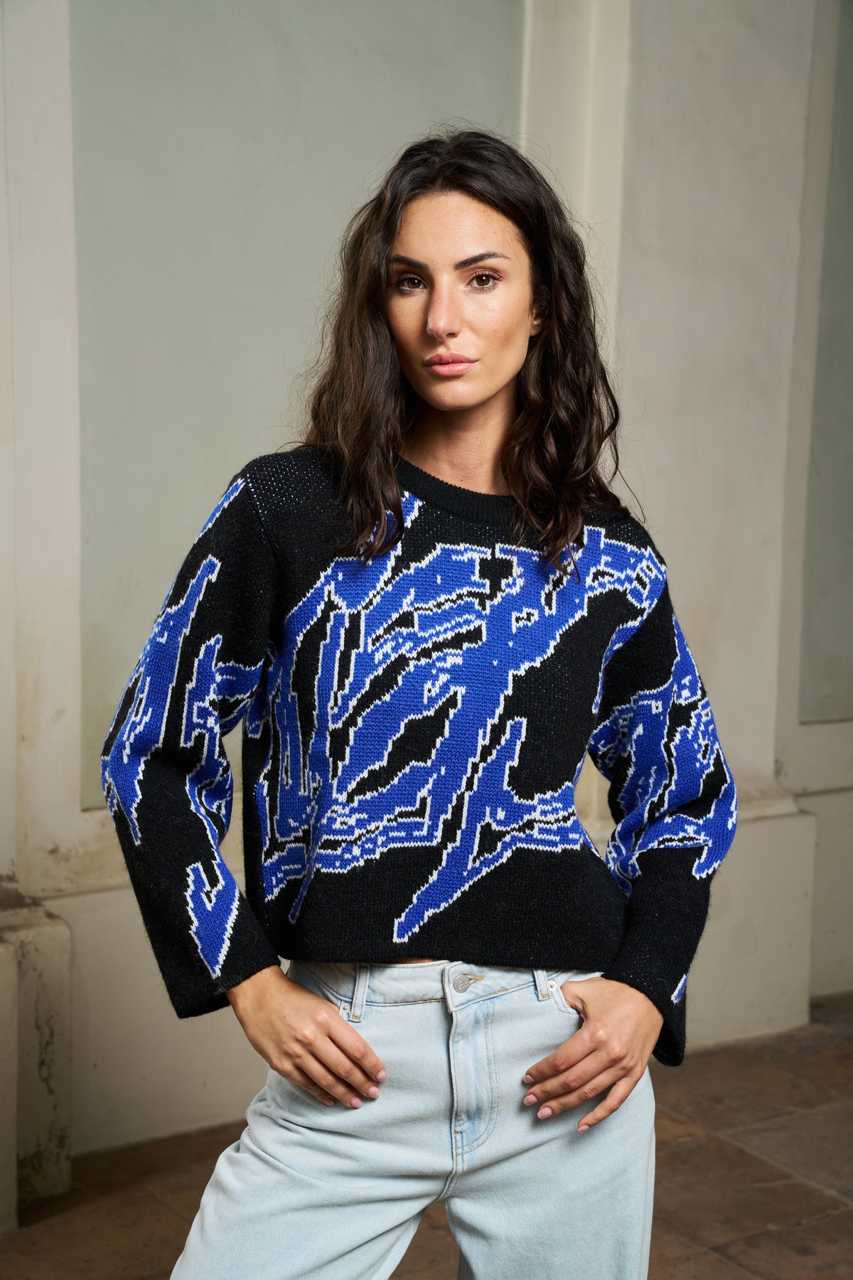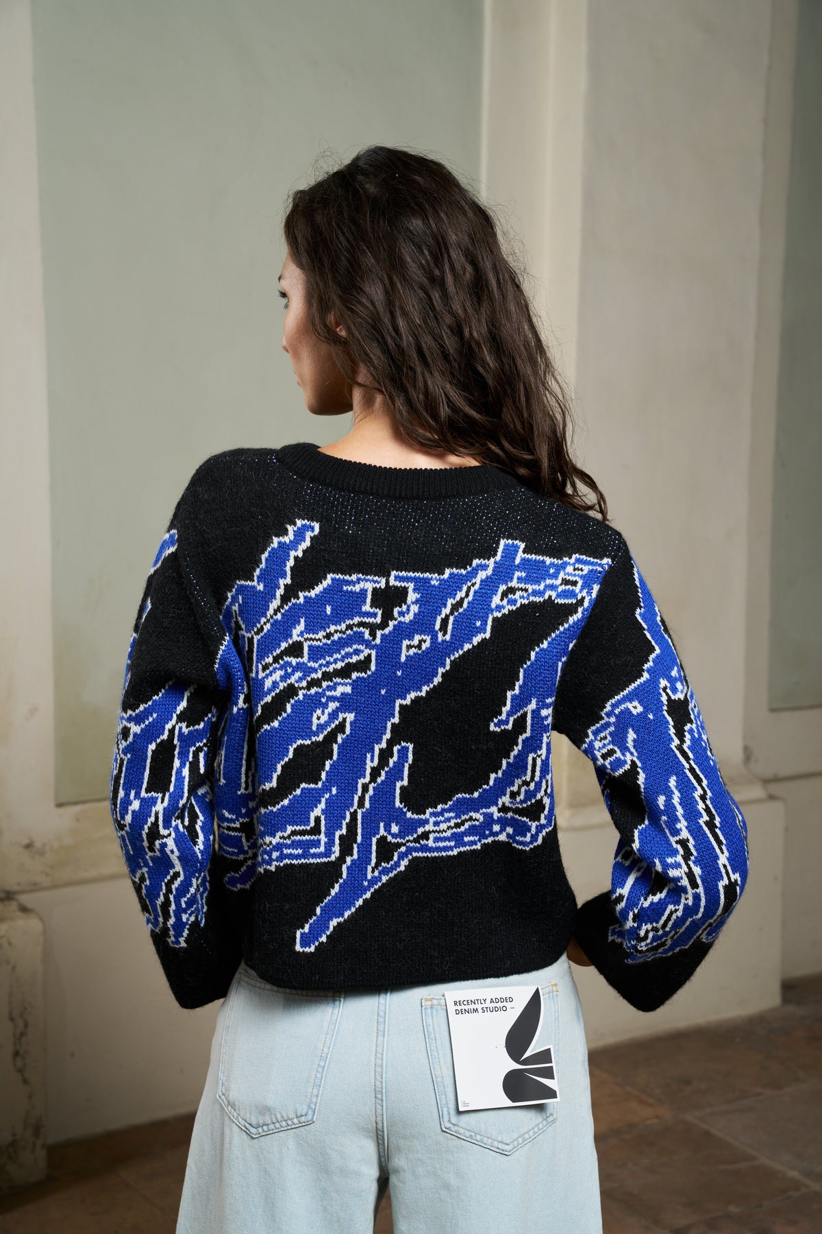 Il maglione ha una vestibilità corta e rilassata, ed è realizzato in un mix di 75% acrilico, 10% lana, 5% alpaca, 5% viscosa e 5% poliestere. Presenta maniche aperte e lavorazione jacquard.