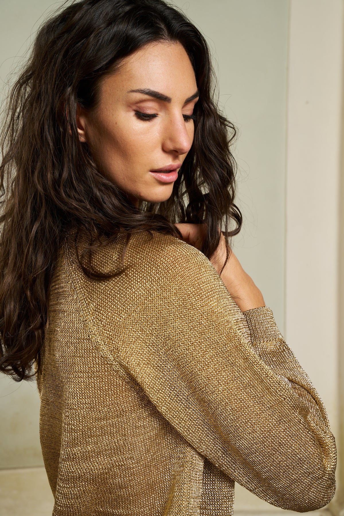 Made entirely of lightweight lurex knit, the impeccable cut, enhanced by the small round neckline, makes it a must-have, easy to wear and match.