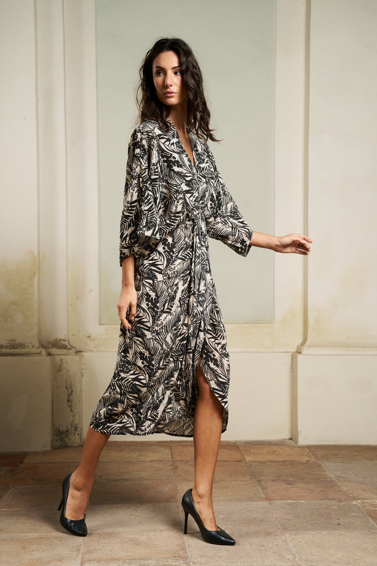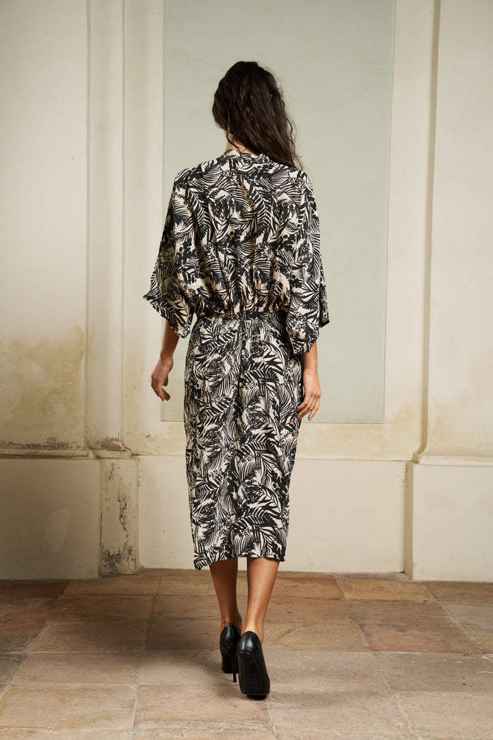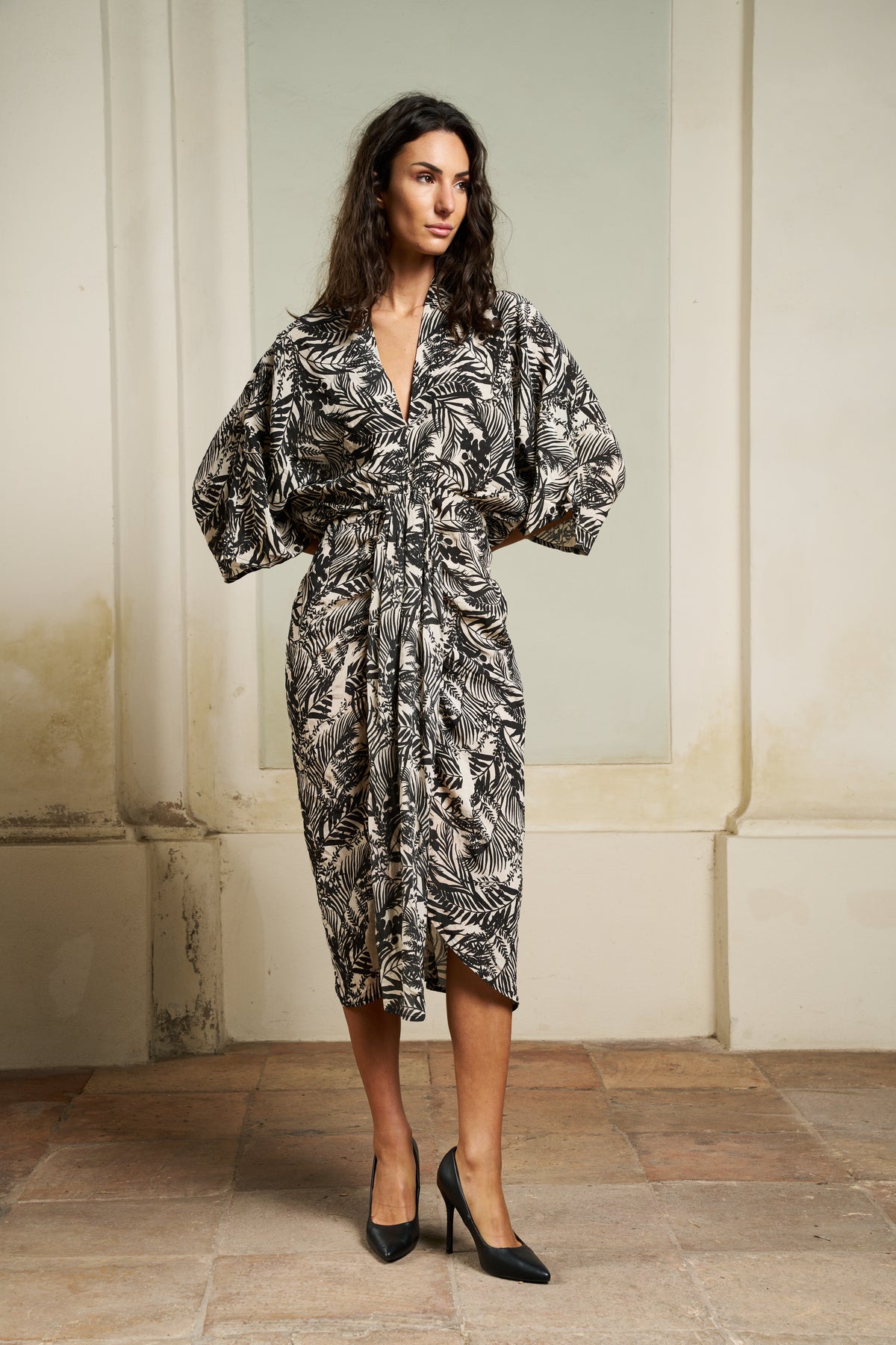 The Juno maxi dress captures attention with its sophisticated and casual allure. The deep V-neck and butterfly sleeves create an effortless elegance, while the layered ruffle at the front waist adds a touch of sophistication. The elastic apron at the back enhances the feminine silhouette, while ensuring a comfortable and flawless fit.