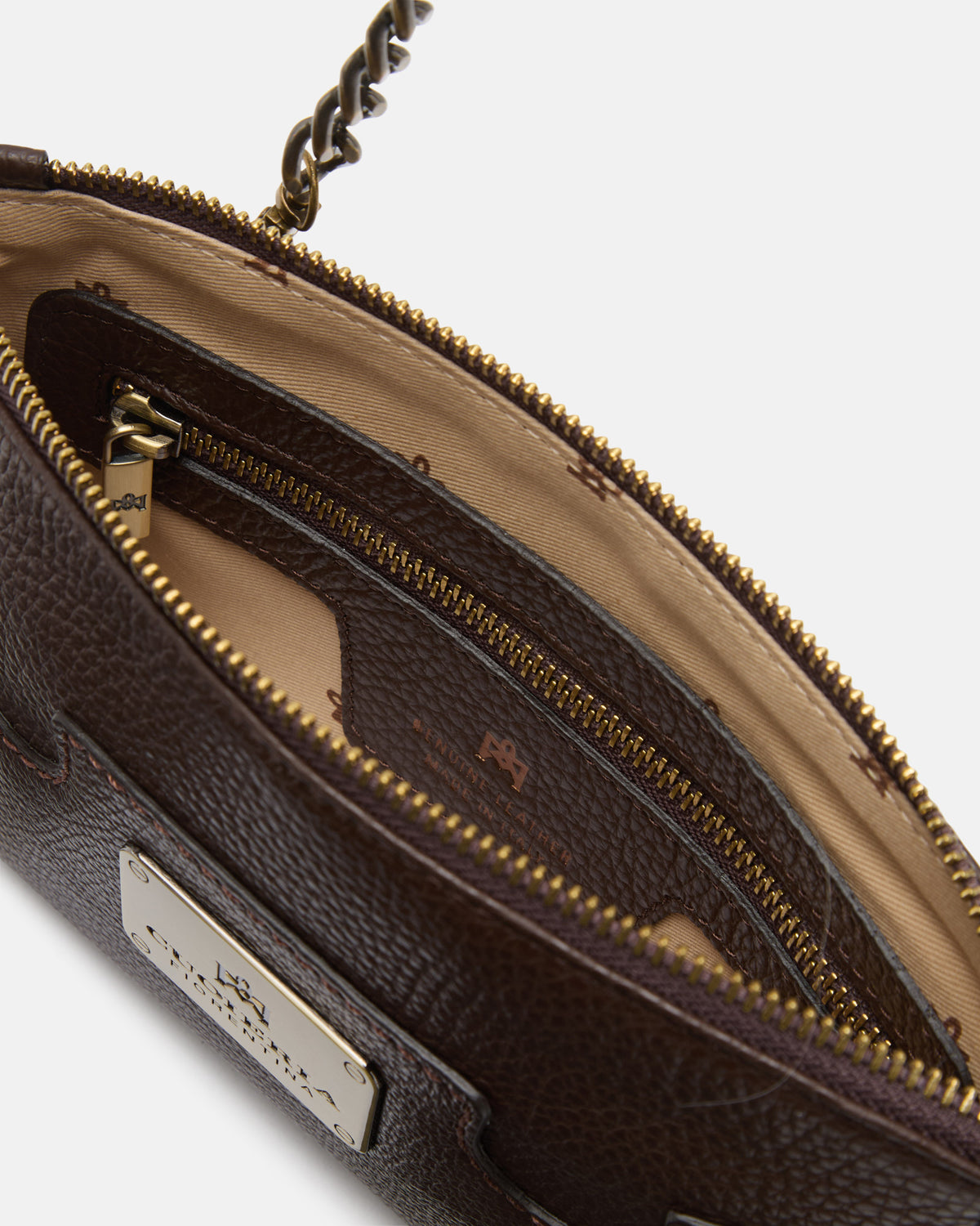 Dettagli della borsa Bella Selleria belt bag: singolo scomparto con taschino e tasca con zip, targhetta logata con finitura ottone invecchiato.