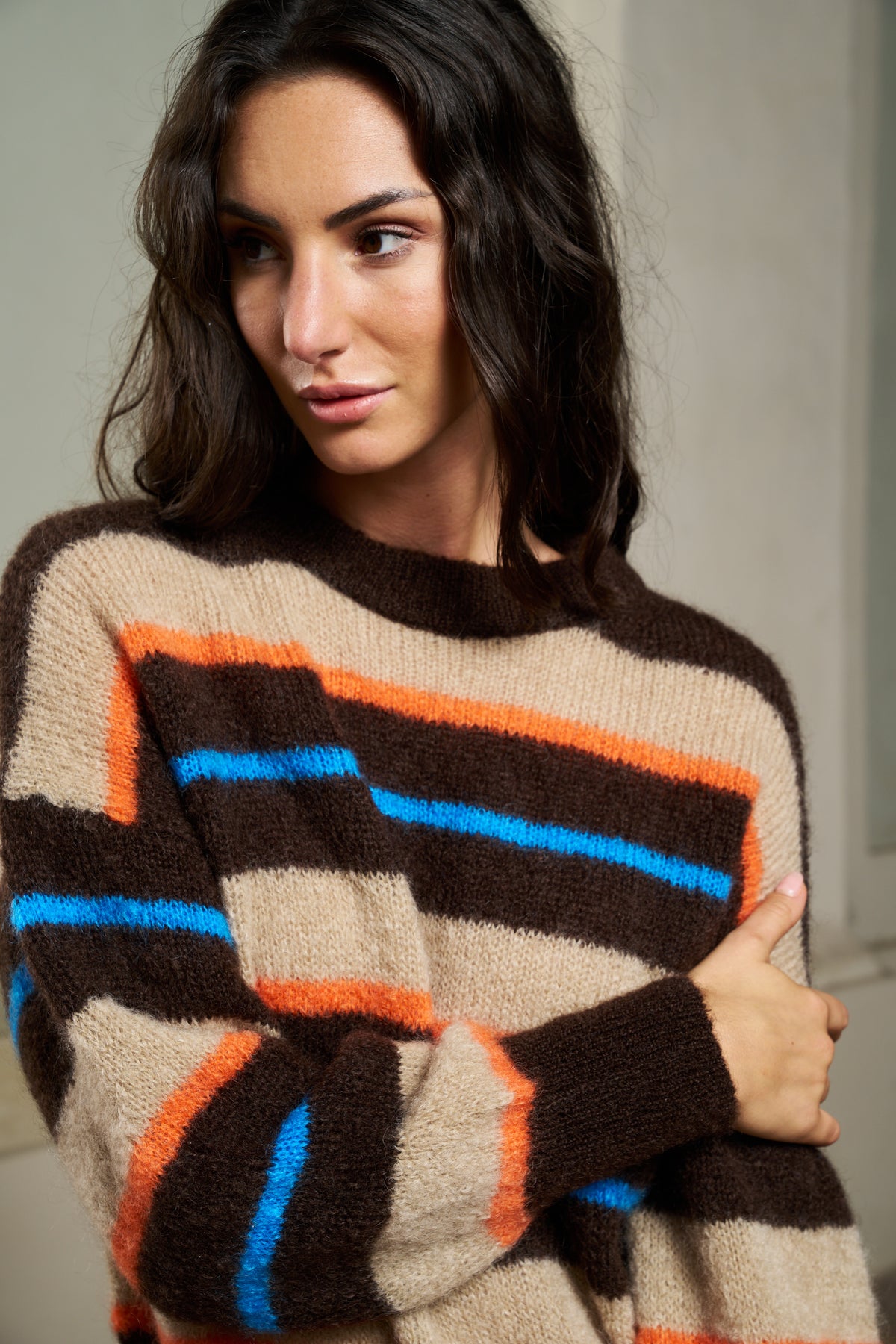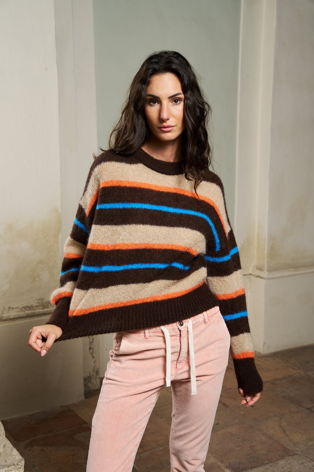 Un pullover soffice come una nuvola e leggero come l’aria. Le righe donano un tocco vivace e senza tempo, mentre il filato in mohair lo rende caldo, avvolgente ed elegante.