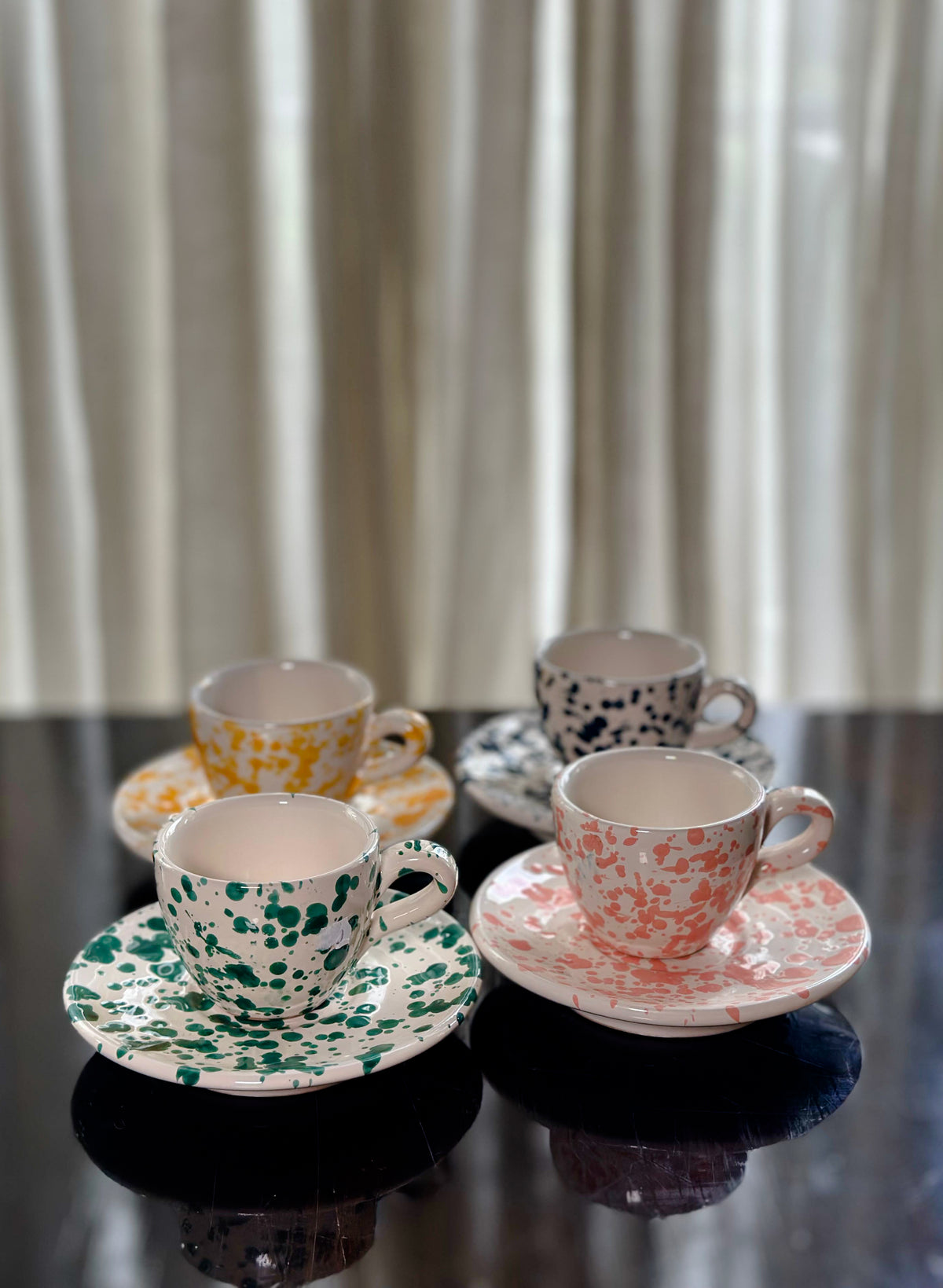 Tazze e piattini dipinti a mano con la tecnica della marezzatura.